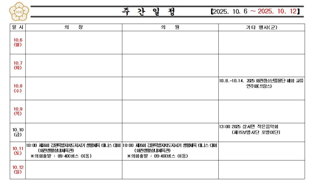 화천군의회 주간행사(2025.10.6.~2025.10.12.) 입니다. 페이지 정보 작성자 : 담당자 날짜 : 작성일25-10-10 09:42 조회 : 128회 이전글 다음글 목록 본문 화천군의회 주간행사(2025.10.6.~2025.10.12.) 입니다. 이전글 다음글 목록